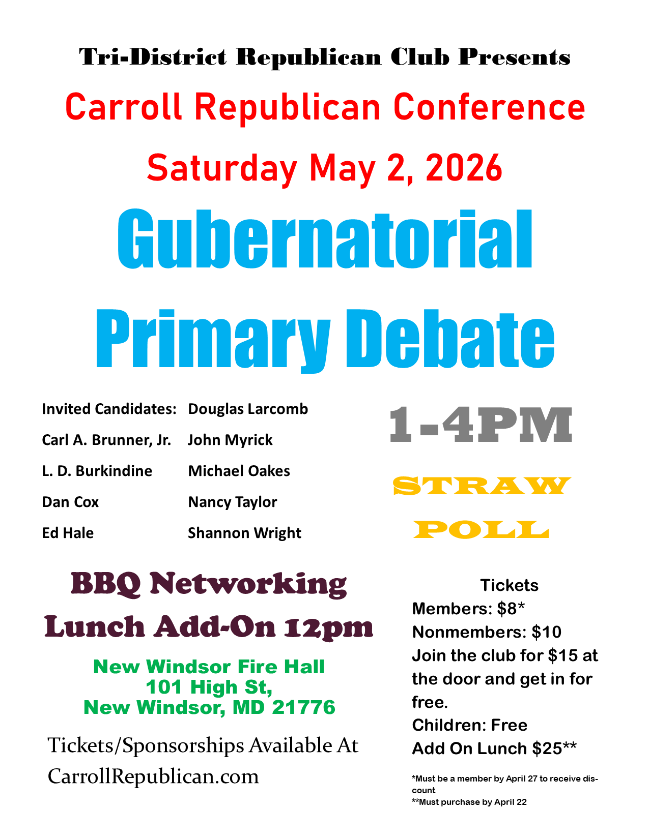 The Tri-District Republican Club founded the Carroll Republican as part of an effort to bolster Republican activism by keeping Republicans in Carroll County up to date on the latest news relating to them. This site is managed by the Membership and Voter Registration Committee (MRV).
